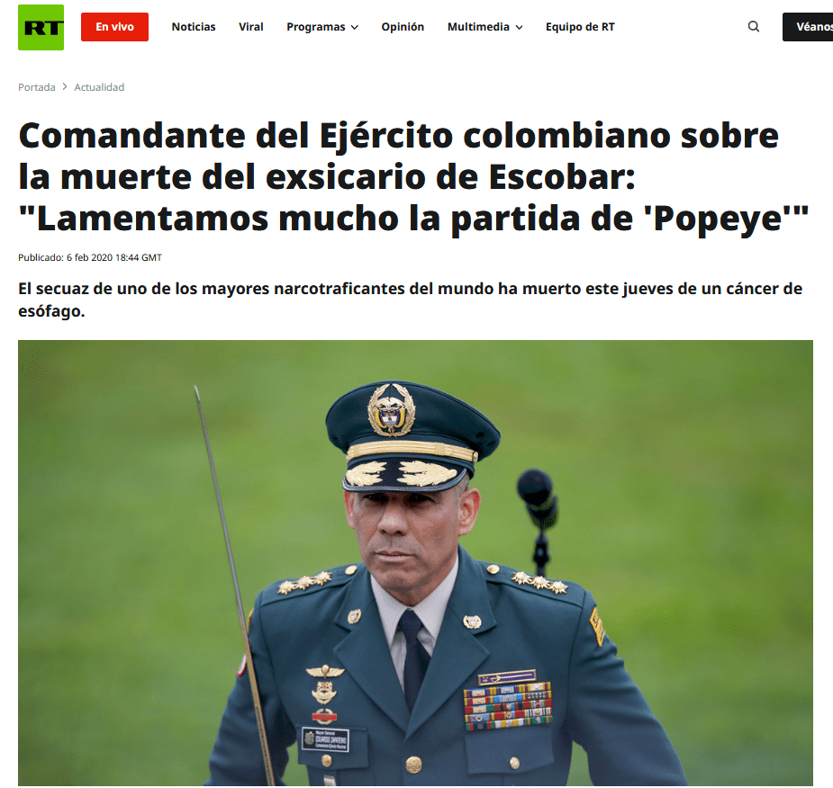 El comandante del Ejército Nacional de Colombia, Eduardo Zapateiro, ha dado sus «sentidas condolencias» a la familia de Jhon Jairo Velásquez Vásques, conocido como ‘Popeye’, quien fue jefe de sicarios del narcotráficante Pablo Escobar y que murió este jueves de un cáncer de esófago.
